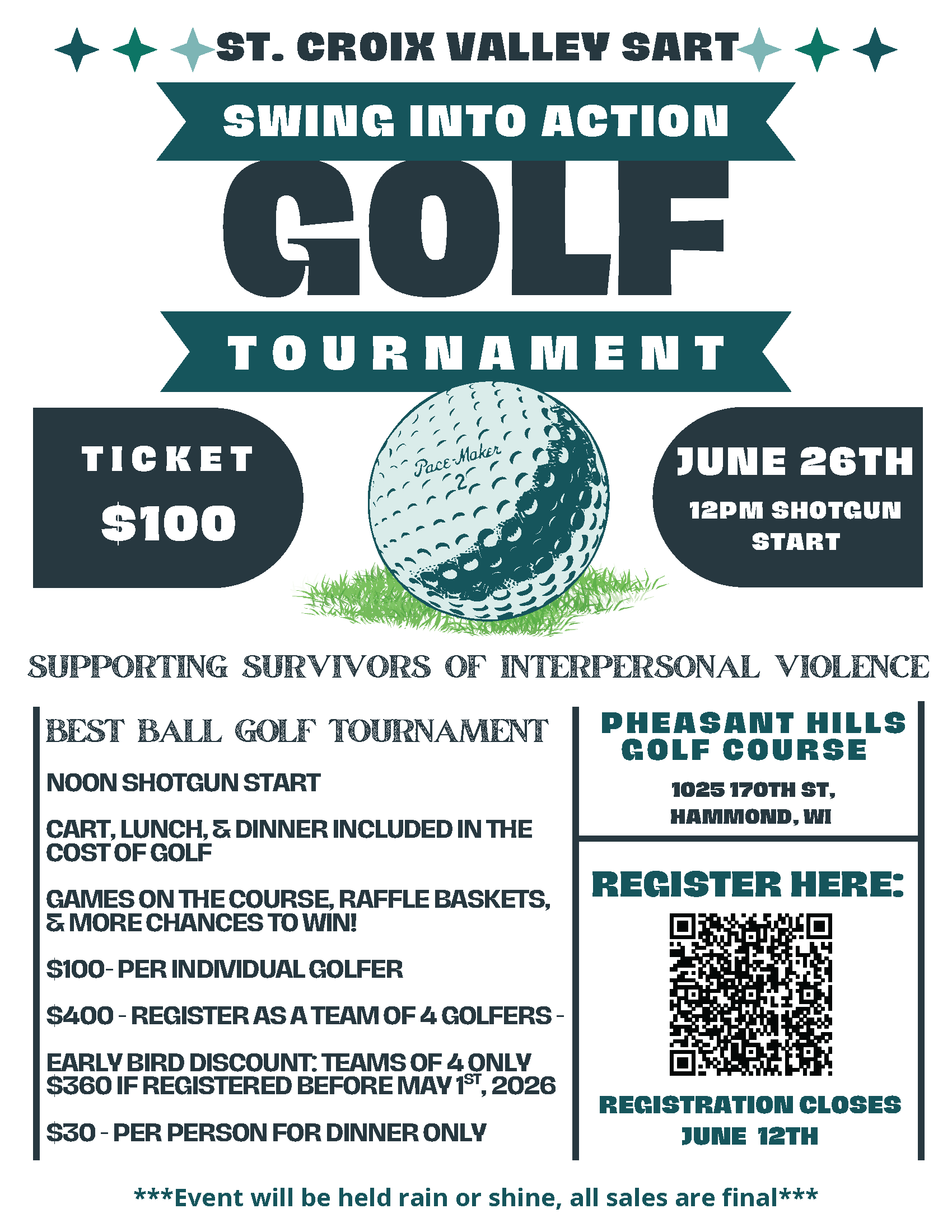 Join us on Friday, June 26, 2026, at Pheasant Hills Golf Course in Hammond, WI for a fun-filled day on the course in support of St. Croix Valley Sexual Assault Response Team (SART).